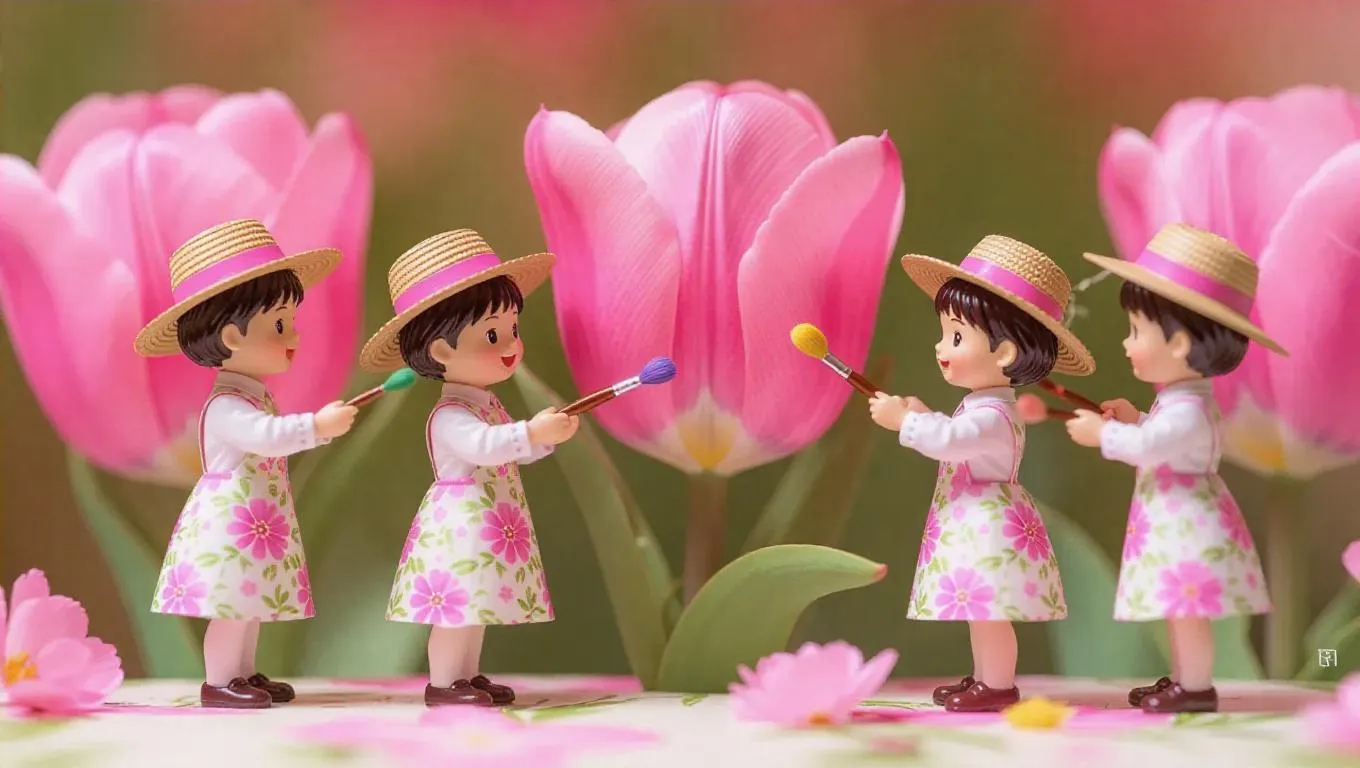 A group of wee figures, wearing cheerful floral uniforms and straw hats, hover around a pink tulip, delicately painting its petals with tiny watercolors. The warm petals and stout stems create a lively ambiance, capturing a moment of artistic expression and flair.