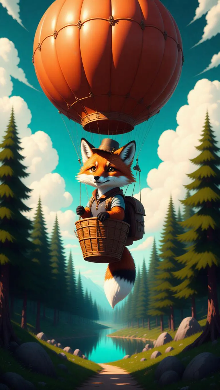 An adventurous fox sails a hot air balloon over a mystical forest, its eyes gleaming with curiosity. The fox wears a explorer's hat and carries a small backpack. Below, towering trees and meandering paths create an enchanting scene, with woodland creatures peeking out. In the distance, a shimmering lake sparkles in the sunlight. The sky is a deep teal, with fluffy clouds gathering.