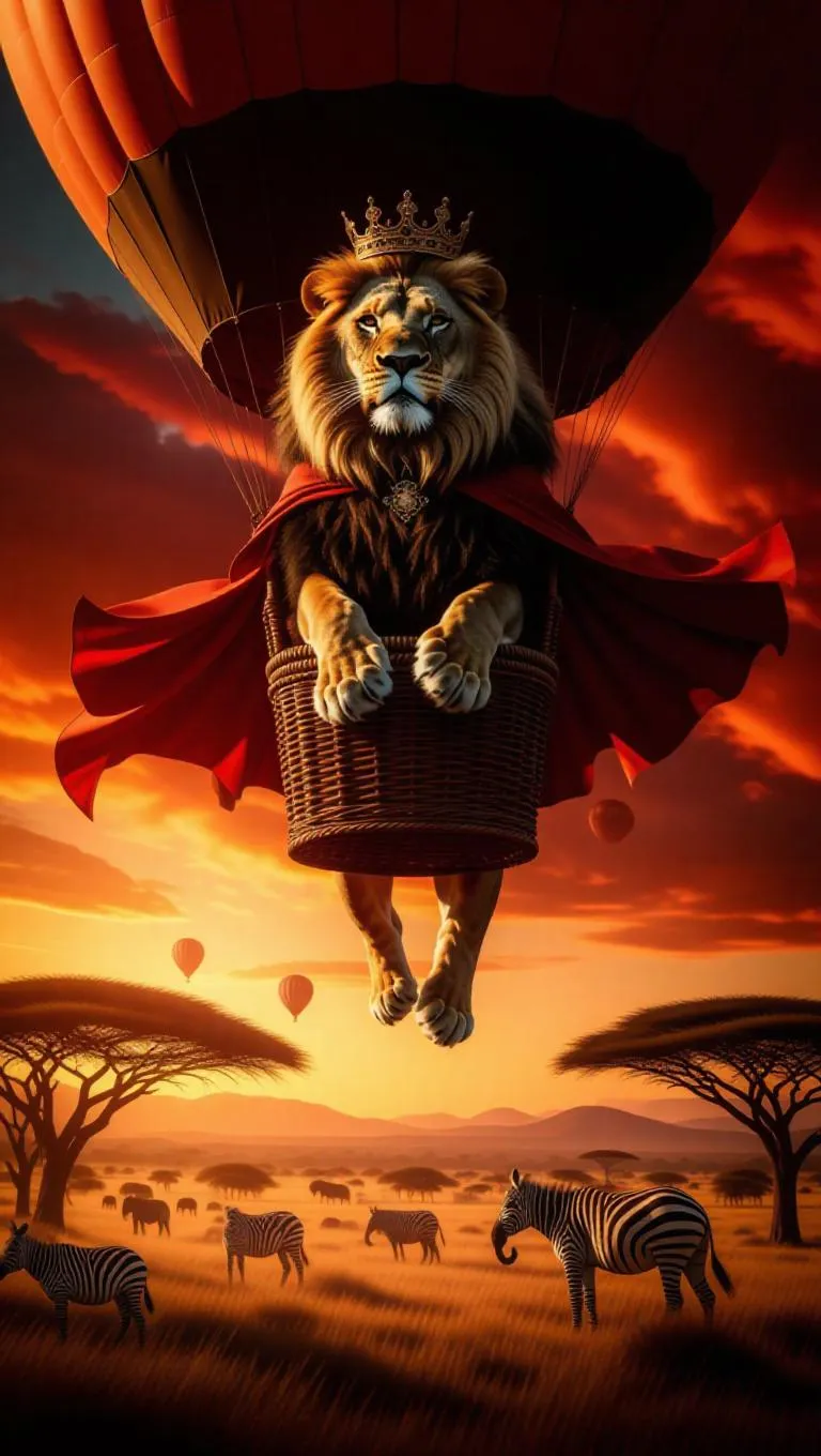 A bold lion takes to the skies in a hot air balloon over a bustling savannah, its mane blowing majestically. The lion wears a crown and a cape fluttering behind. Below, acacia trees and grazing animals create a wild panorama, with zebras and elephants visible. In the distance, a sunset paints the horizon. The sky is a fiery red, with dramatic clouds swirling.