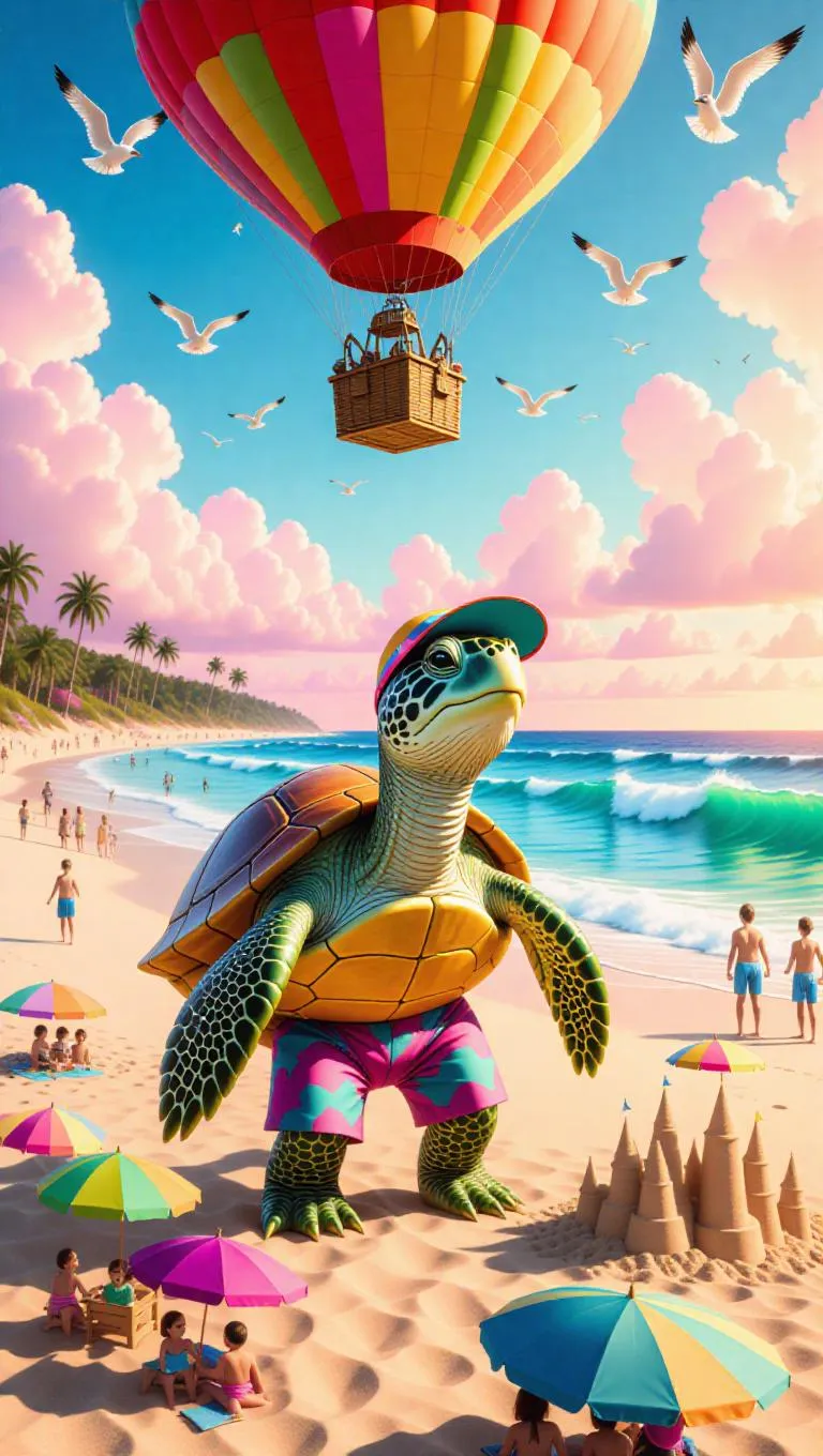 A whimsical turtle observes from a hot air balloon flying over a sandy beach, its shell polished and shining. The turtle wears a colorful sun visor and beach shorts. Below, children build sandcastles along the shoreline, with vibrant umbrellas dotting the sand. In the distance, surfers ride the waves. The sky is a cheerful coral, with seagulls gliding by.