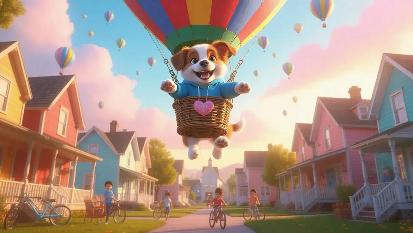 A sweet puppy plays in a hot air balloon above a friendly neighborhood, its tail wagging joyfully. The puppy wears a tiny hoodie and sneakers. Below, colorful houses and children playing set the scene, with bicycles parked nearby. In the distance, a playground invites laughter. The sky is a playful gradient of pink and blue.
