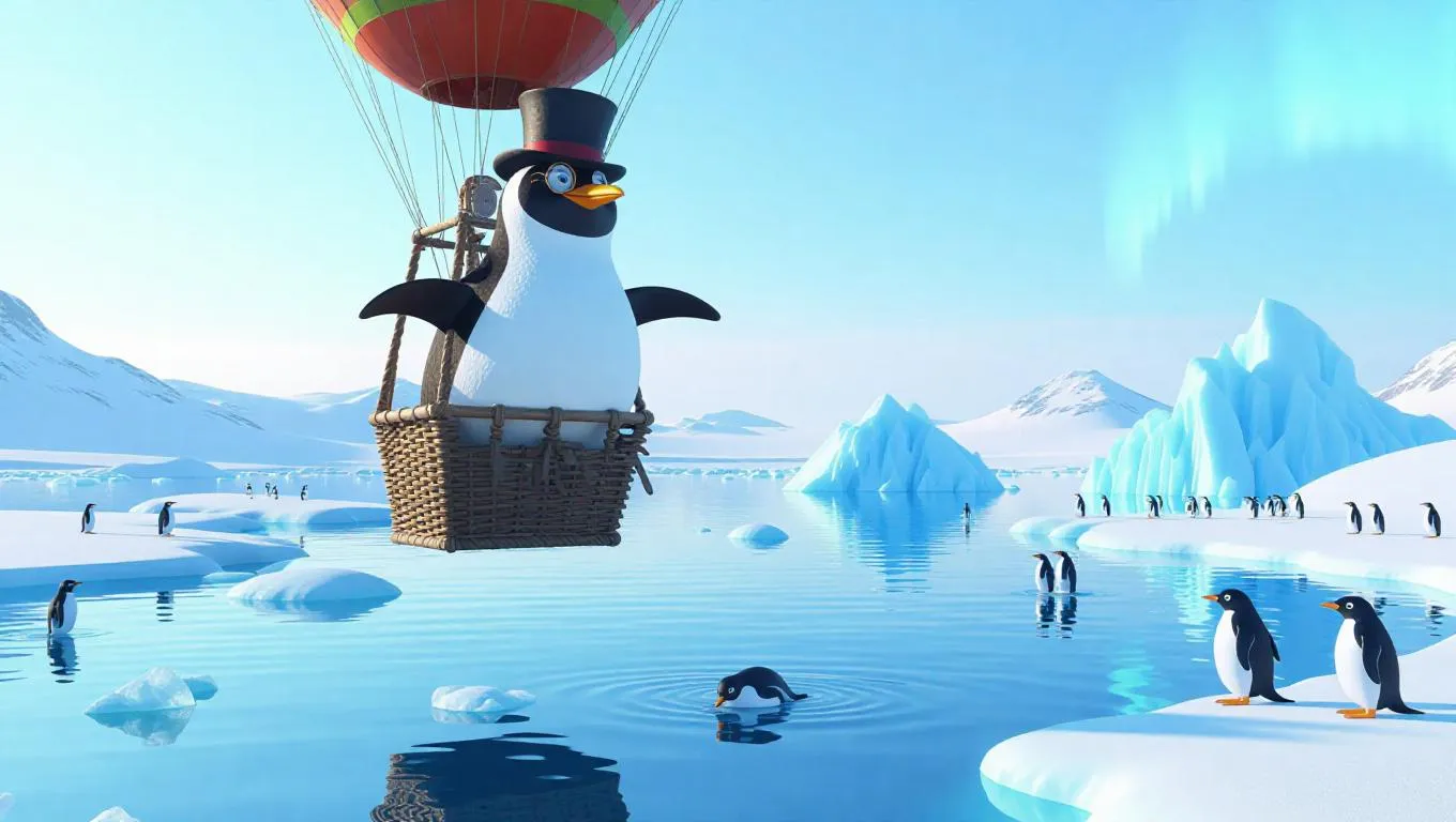 A dapper penguin sails in a hot air balloon over a chilly Arctic landscape, its tuxedo pristine. The penguin wears a top hat and monocle. Below, icy waters and snow-covered land create a stunning scene, with fellow penguins waddling along the shore. In the distance, icebergs float serenely. The sky is a crisp light blue, with the aurora borealis beginning to dance.