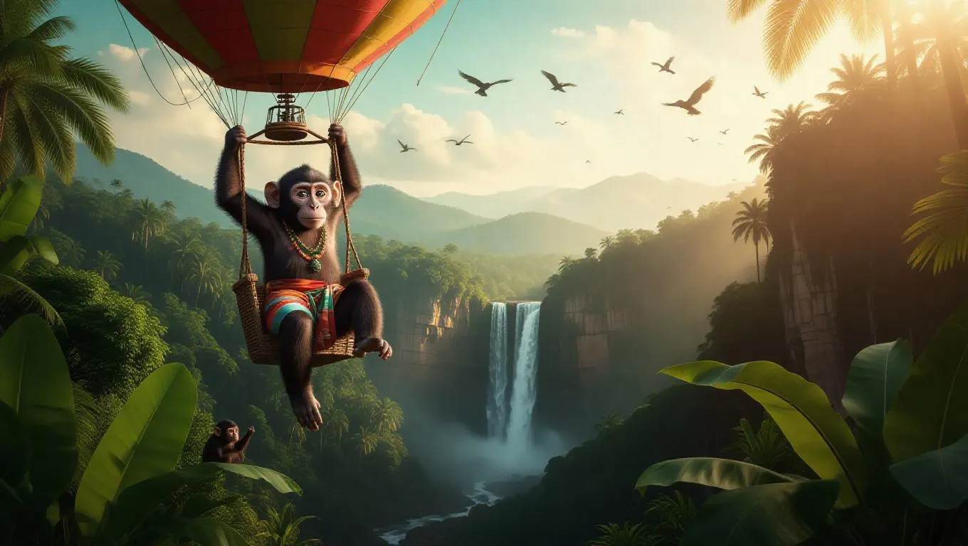 An agile monkey swings in a hot air balloon over a lush jungle, its curiosity palpable. The monkey wears a colorful sarong and necklace. Below, thick greenery and vibrant flora create a vivid tapestry, with monkeys playing in the trees. In the distance, a waterfall cascades down rocky cliffs. The sky is a dazzling emerald, with birds soaring through the treetops.