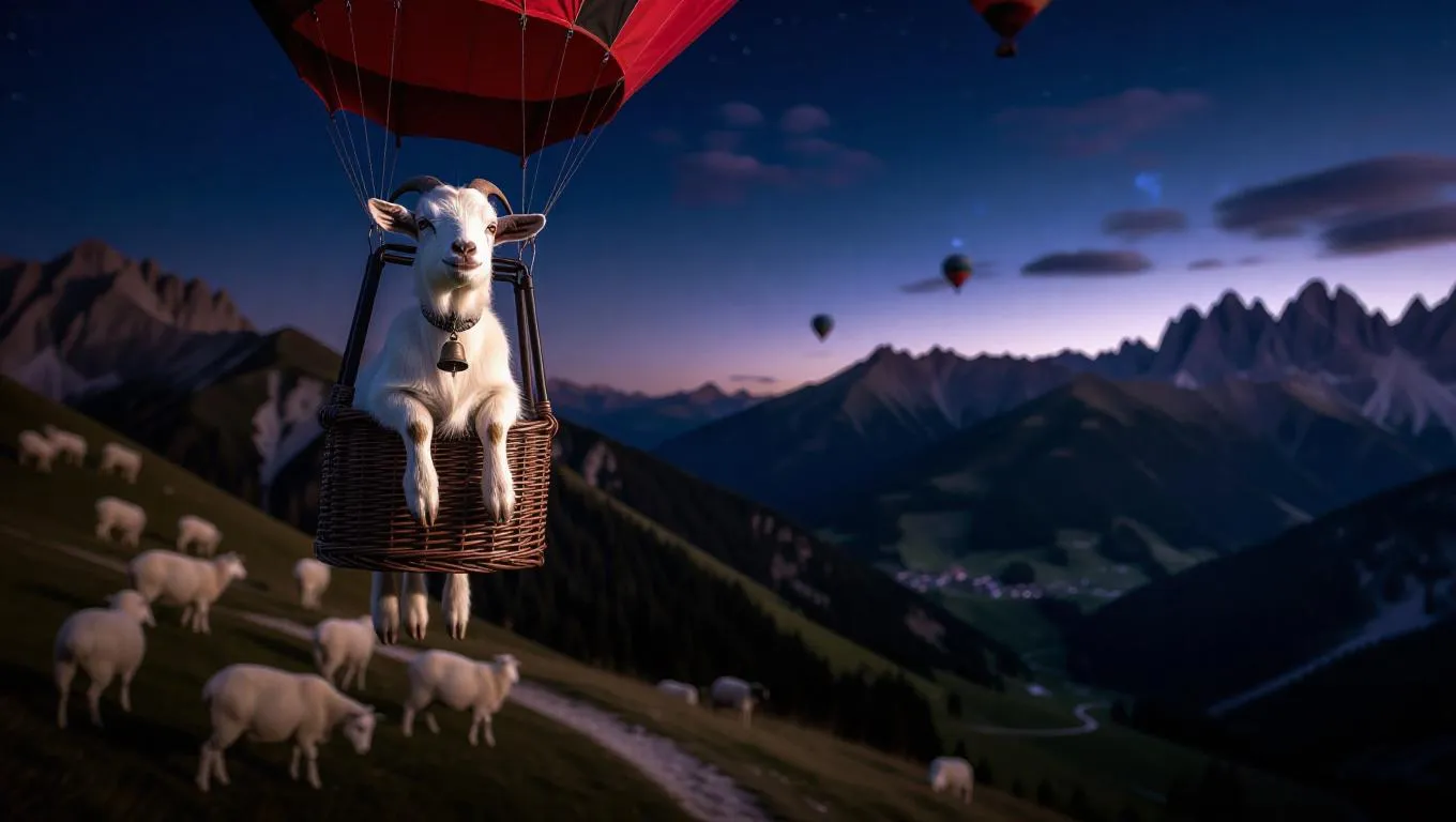 A curious goat balances in a hot air balloon soaring over a mountainous region, its eyes bright with wonder. The goat wears a small bell around its neck. Below, steep slopes and grazing sheep add to the rustic scenery, with rocky paths crisscrossing. In the distance, a quaint farm can be glimpsed. The sky is a deep navy, with twinkling stars beginning to shine.