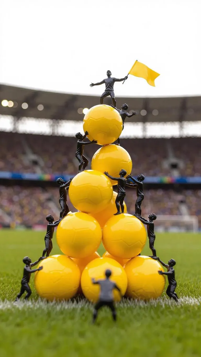 The group of small figurines, resembling athletes, are diligently carrying a large yellow ball up a tall stack of similar balls. One figurine at the top throws a flag that drips down, and another at the base waits to catch it. The camera pans from the bottom to the top, capturing the synchronized effort and the vibrant yellow contrasted against the dark background. The background features a field stadium, adding a sense of competition to the scene.