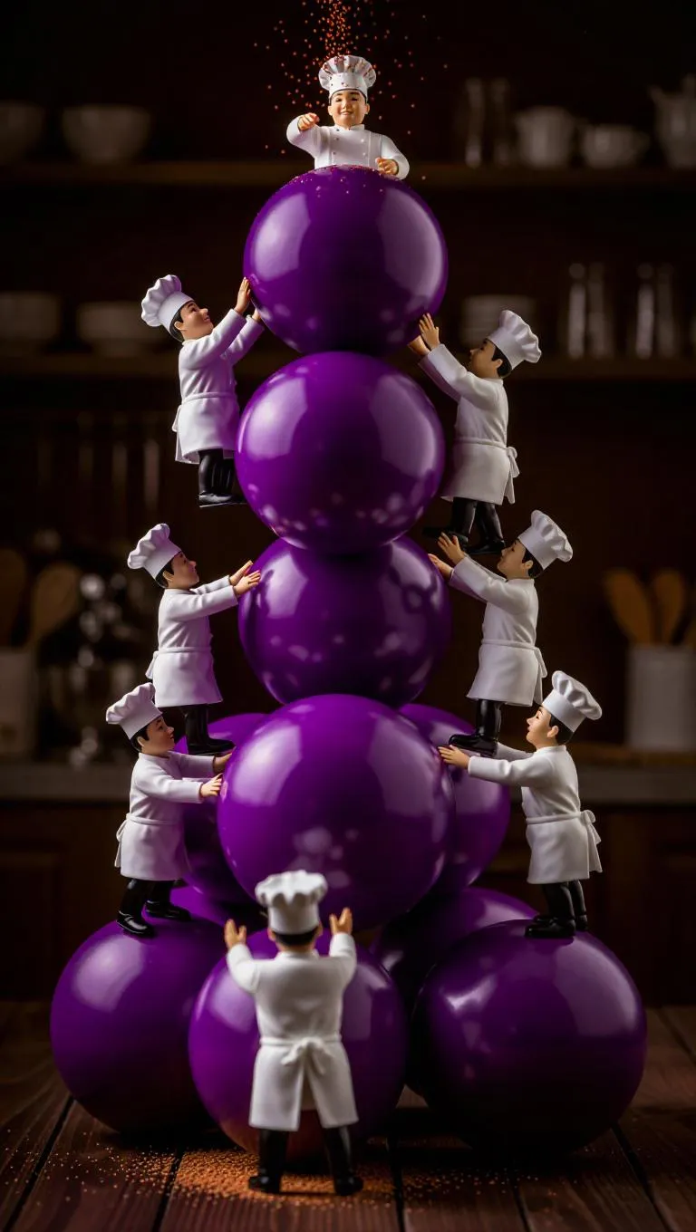 The group of small figurines, resembling chefs, are diligently carrying a large purple ball up a tall stack of similar balls. One figurine at the top sprinkles spices that drip down, and another at the base waits to catch it. The camera pans from the bottom to the top, capturing the synchronized effort and the vibrant purple contrasted against the dark background. The background features a cozy kitchen, adding a sense of warmth to the scene.