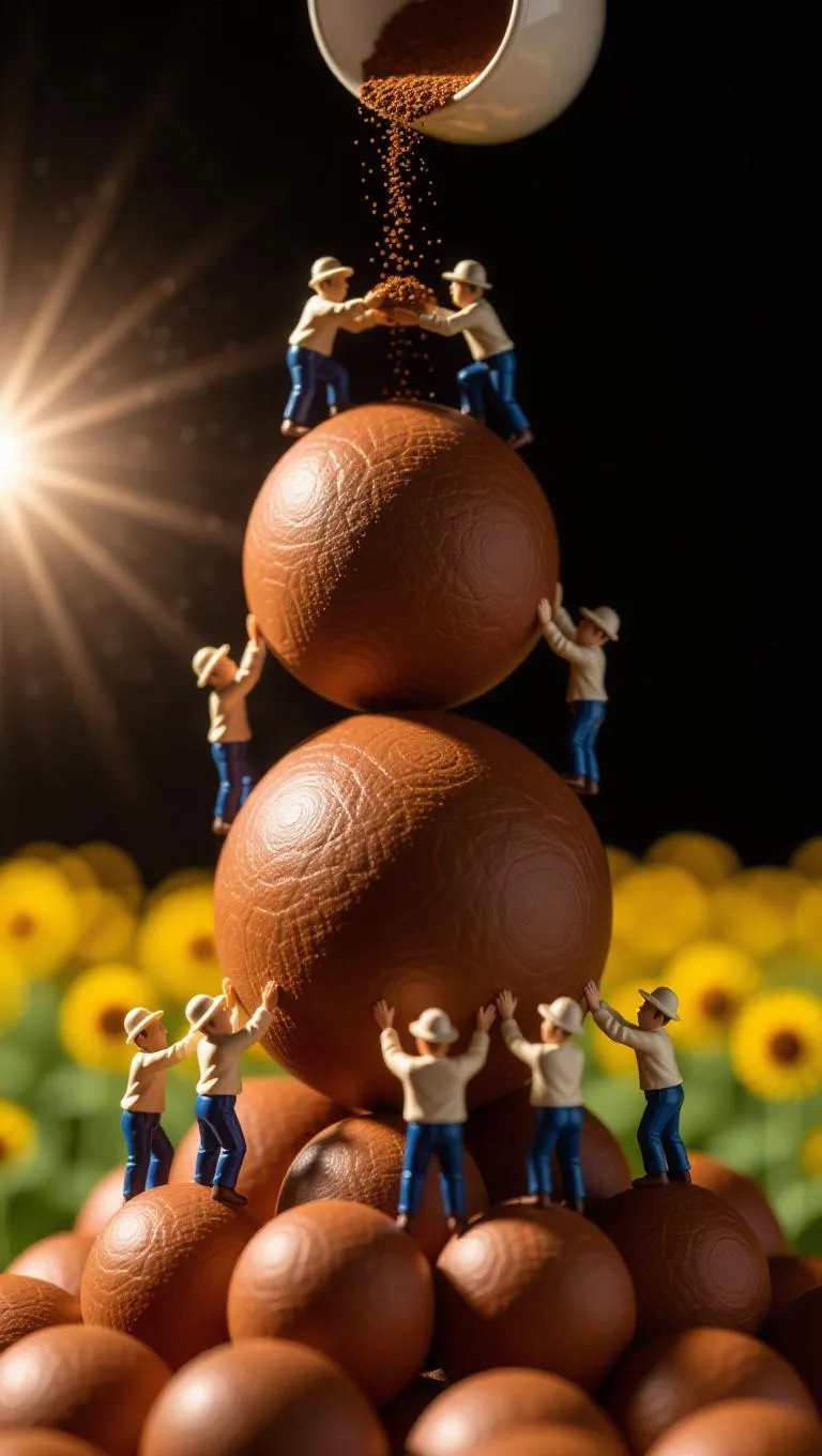 The group of small figurines, resembling farmers, are diligently carrying a large brown ball up a tall stack of similar balls. One figurine at the top pours soil that falls down, and another at the base waits to catch it. The camera pans from the bottom to the top, capturing the synchronized effort and the vibrant brown contrasted against the dark background. The background features a sunny field, adding a sense of tranquility to the scene.