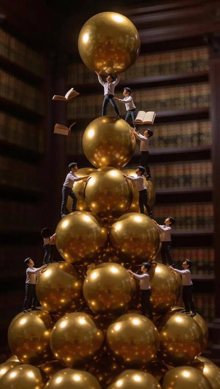 The group of small figurines, resembling students, are diligently carrying a large golden ball up a tall stack of similar balls. One figurine at the top drops books that flutter down, and another at the base waits to catch it. The camera pans from the bottom to the top, capturing the synchronized effort and the vibrant gold contrasted against the dark background. The background features a grand library, adding a sense of knowledge to the scene.