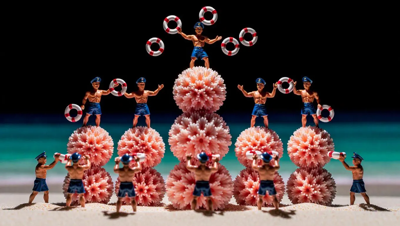 The group of small figurines, resembling lifeguards, are diligently carrying a large coral ball up a tall stack of similar balls. One figurine at the top throws life buoys that drop down, and another at the base waits to catch them. The camera pans from the bottom to the top, capturing the synchronized effort and the vibrant coral contrasted against the dark background. The background features a sunny beach, adding a sense of relaxation to the scene.