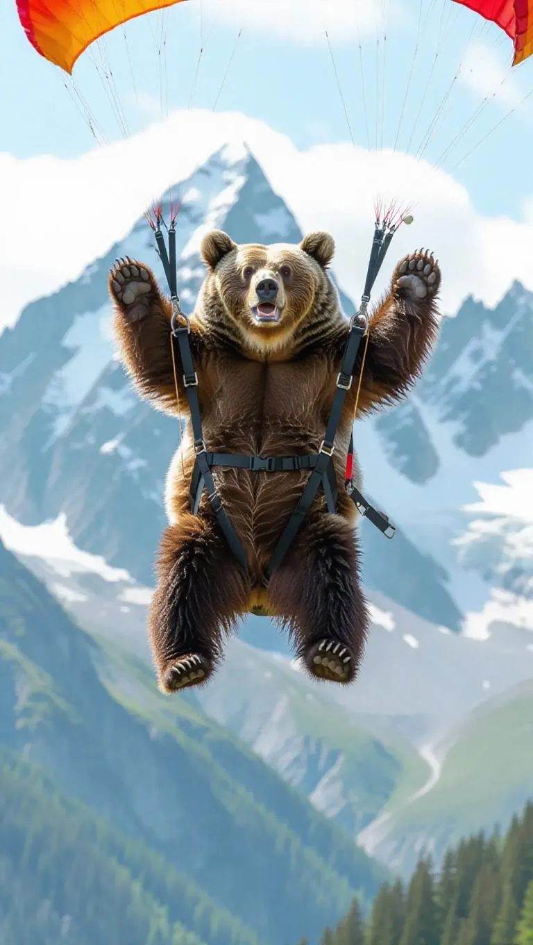 The bear paraglides through the shot flashing a big grin and a wave, with a serene mountain range casting a cool glow over the landscape.
