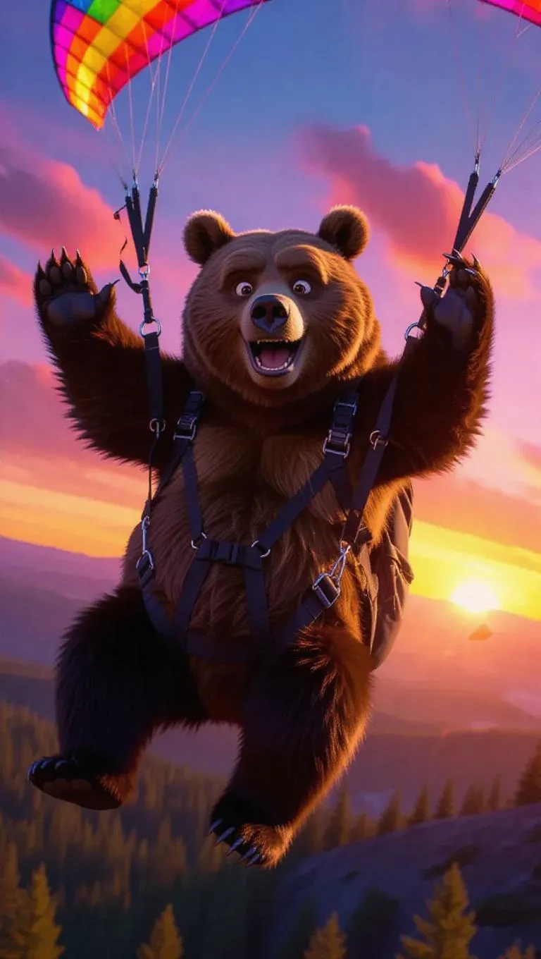 The bear hang glides through the shot sporting a mischievous smirk and a playful wave, with a colorful sunrise painting the sky over the valley.