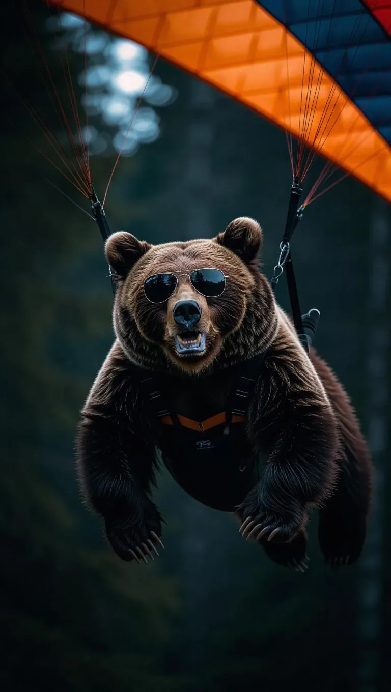 The bear hang glides gracefully through the shot wearing sunglasses and a wide grin, with a dusky twilight illuminating the forest below.