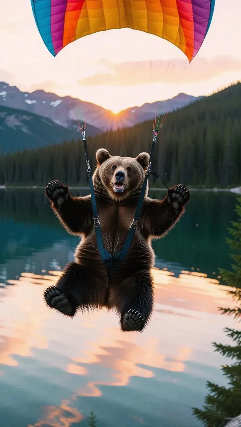 The bear hang glides through the shot showcasing an adventurous pose and a big smile, with a pastel sunset reflecting off the lake.