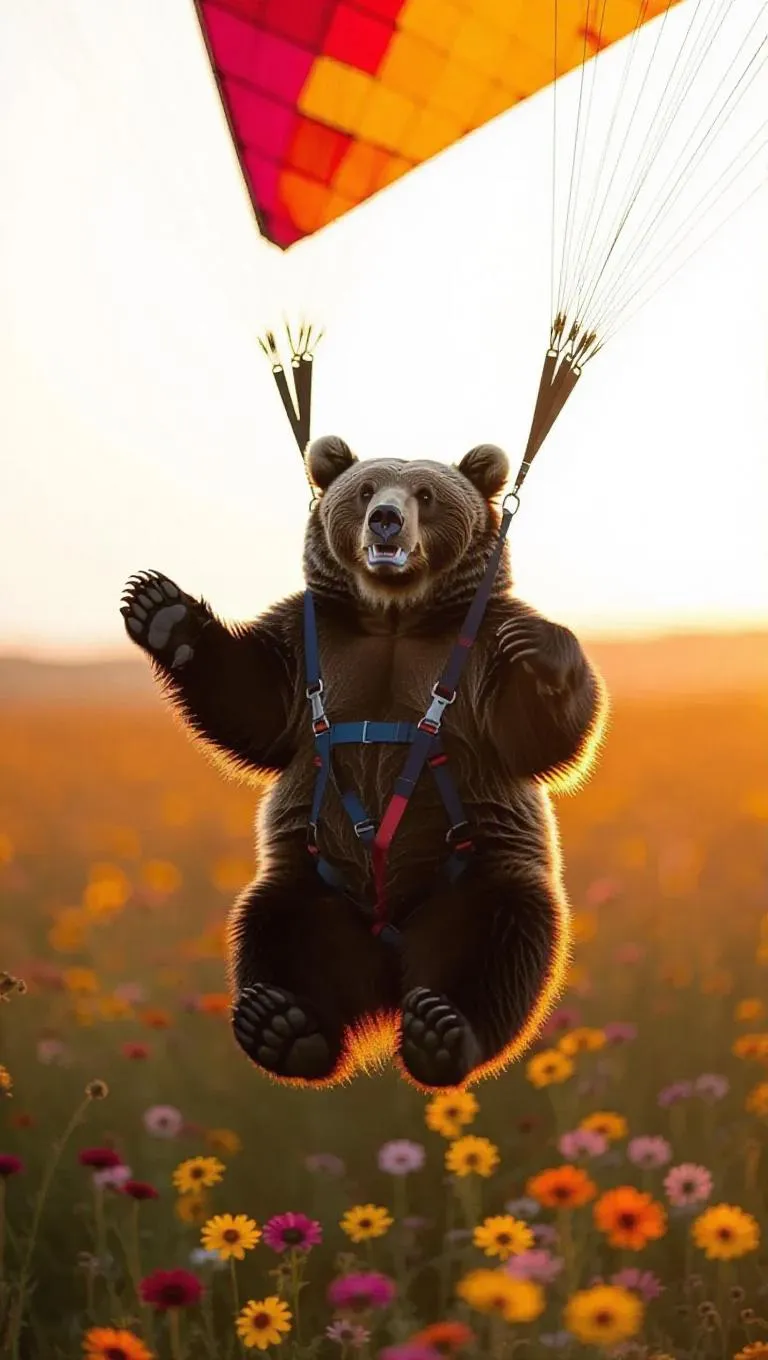 The bear hang glides through the shot spinning in circles while grinning, with a tranquil field of flowers brightened by the golden hour.