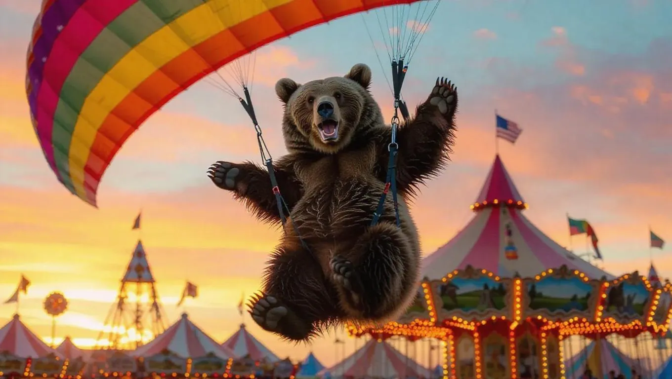 The bear hang glides through the shot playfully somersaulting and laughing, against a backdrop of a colorful carnival at sunset.