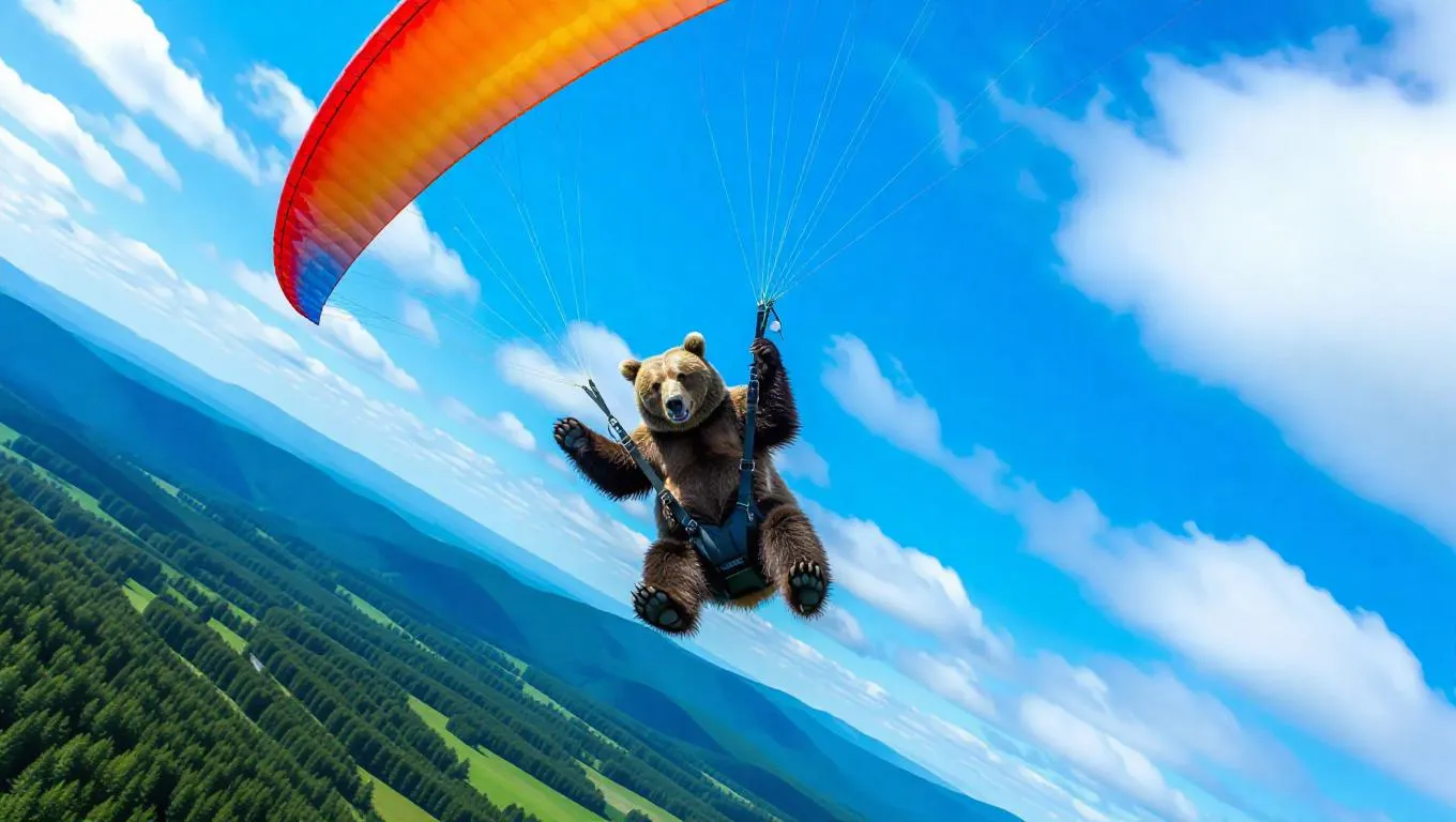 The bear hang glides through the shot energetically high-fiving the camera, with a bright blue sky dotted with fluffy white clouds.