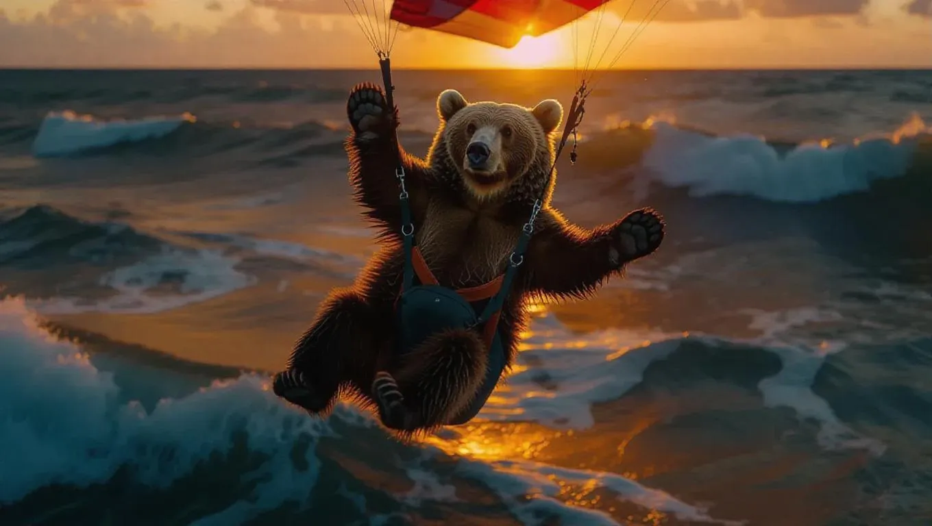 The bear hang glides through the shot dramatically posing with one paw in the air, amidst a background of roaring ocean waves at sunset.