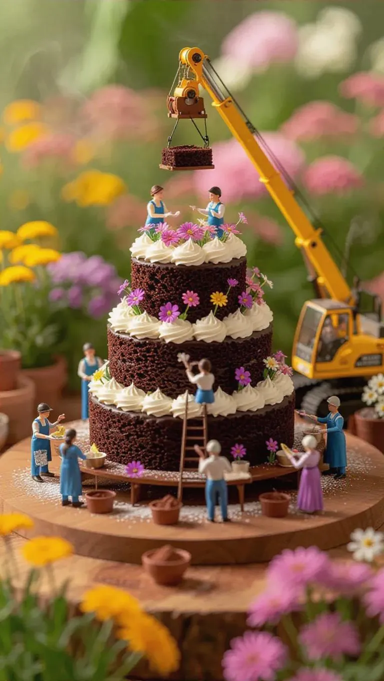 A whimsical botanical workshop where a towering chocolate cake is being built by thumb-sized gardeners. A miniature crane carefully lifts a fresh layer of chocolate sponge cake, while tiny bakers decorate it with whipped cream using small spatulas. Some workers place edible flowers like decorations, while others carefully sprinkle cocoa powder from tiny bowls. Steam rises gently, hinting at the warmth of the freshly baked dessert, while the blurred background reveals a vibrant garden filled with colorful plants and flowers.