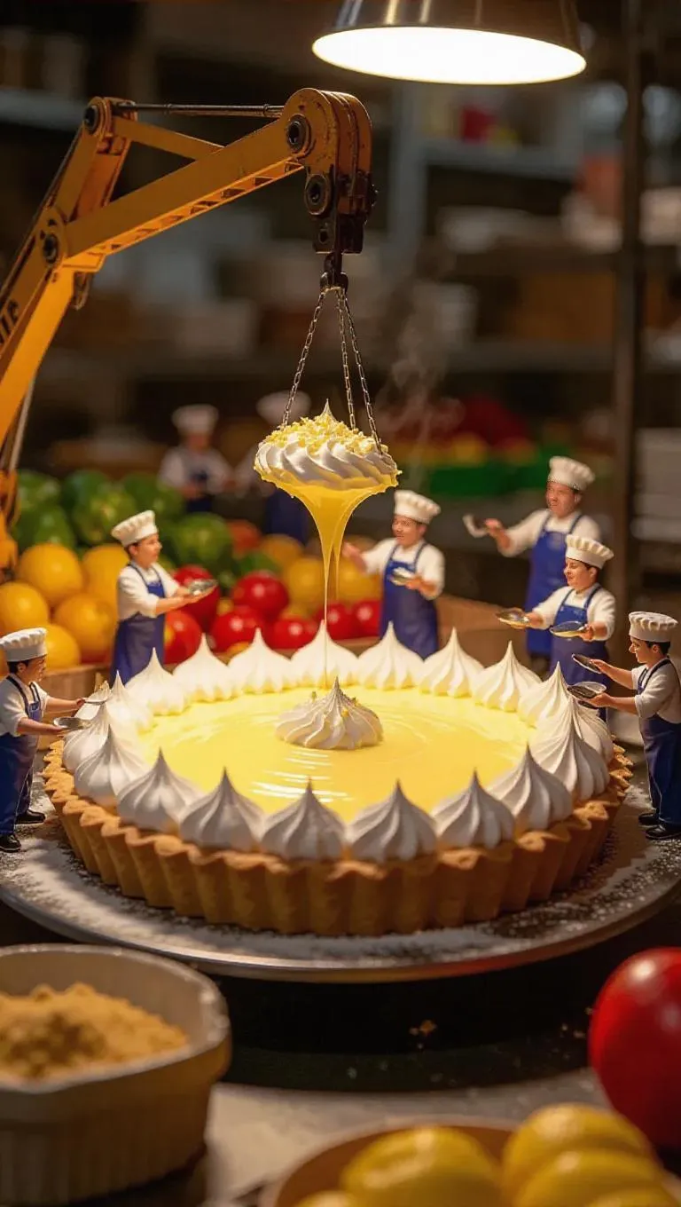 A bustling market stall where a huge lemon meringue pie is being prepared by thumb-sized chefs. A miniature crane carefully lifts a new layer of lemon curd, while tiny bakers swirl meringue using small spatulas. Some workers add lemon zest for decorations, while others carefully sprinkle graham cracker crumbs from tiny bowls. Steam rises gently, hinting at the tangy aroma of baked goods, while the blurred background reveals colorful fruits and vegetables on display.