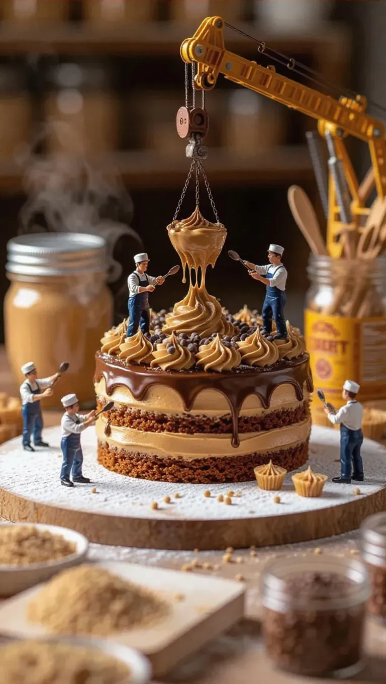 A creative workshop where a giant peanut butter cake is being crafted by thumb-sized culinary artists. A miniature crane lifts a fresh layer of peanut butter sponge cake, while tiny bakers spread chocolate frosting with small spatulas. Some workers add mini chocolate chips as decorations, while others sprinkle crushed peanuts from tiny bowls. Steam rises gently, hinting at the nutty sweetness of the dessert, while the blurred background reveals an array of baking tools and peanut butter jars.