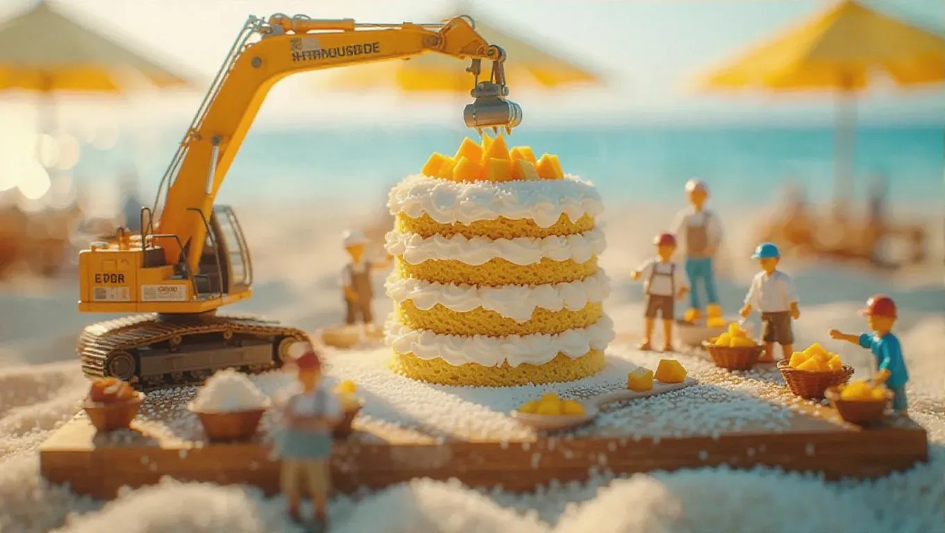 A serene beach picnic where an enormous mango cake is being crafted by thumb-sized beachgoers. A miniature crane carefully lifts a fresh layer of mango sponge cake, while tiny bakers spread coconut frosting using small spatulas. Some workers place mango chunks like decorations, while others carefully sprinkle shredded coconut from tiny bowls. Steam rises gently, hinting at the tropical vibes of summer treats, while the blurred background reveals sand, sun umbrellas, and beach towels.