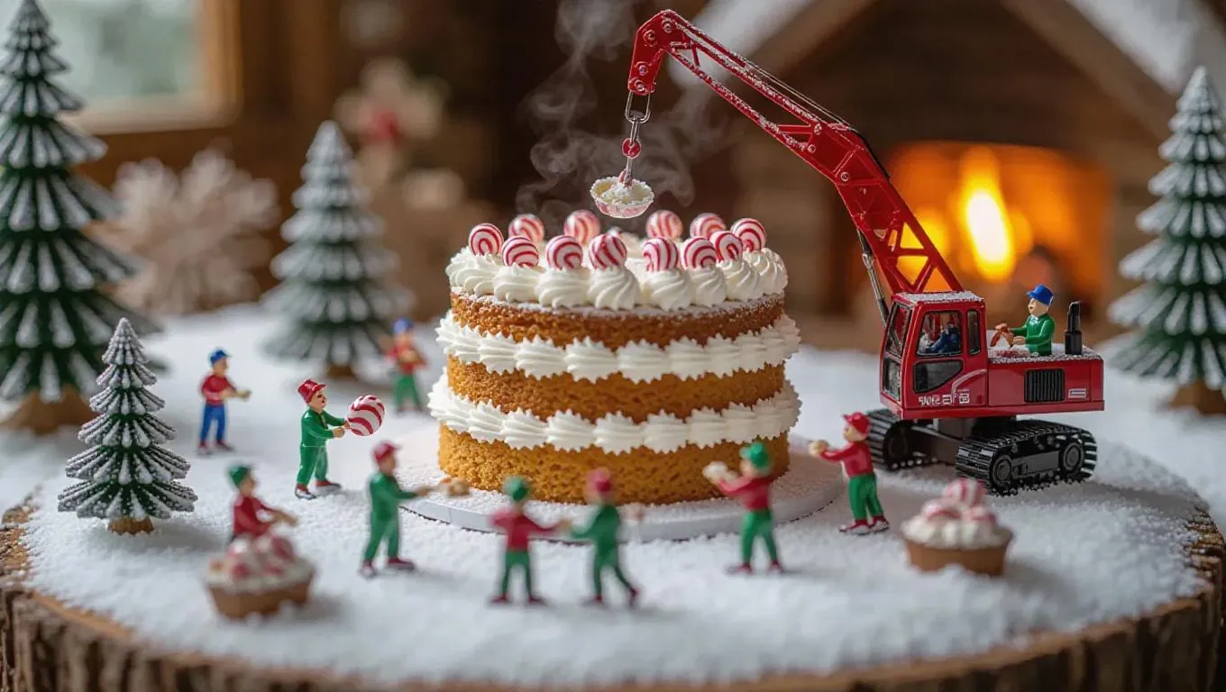 A cozy winter lodge where a gigantic peppermint cake is being constructed by thumb-sized holiday decorators. A miniature crane lifts a fresh layer of peppermint-spiced cake, while tiny bakers spread candy cane frosting with small spatulas. Some workers add crushed peppermint as decorations, while others carefully sprinkle edible glitter from tiny bowls. Steam rises gently, hinting at the warmth of the hearth, while the blurred background reveals log fires and winter decor.