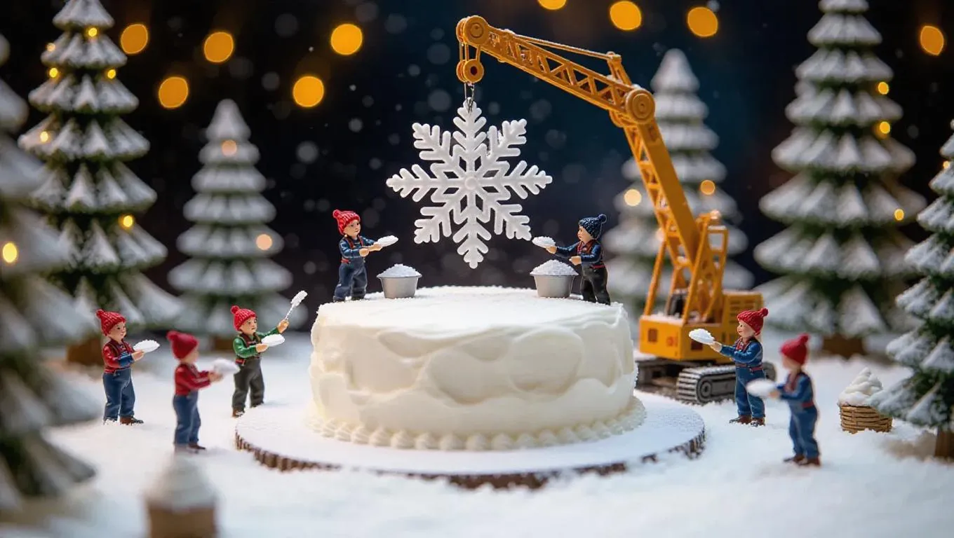 A magical winter wonderland where a giant snowflake cake is being crafted by thumb-sized winter enthusiasts. A miniature crane carefully lifts a new layer of snowy cake, while tiny bakers spread white frosting with small spatulas. Some workers adorn it with edible glitter like decorations, while others carefully sprinkle powdered sugar from tiny bowls. Steam rises gently, hinting at the winter festivities, while the blurred background reveals snow-covered trees and twinkling lights.