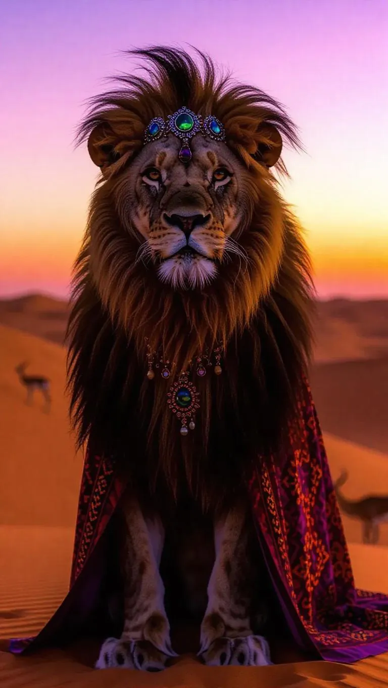 An imposing lion stands guard at the edge of the Sahara Desert in Algeria, its mane fluttering dramatically in the gusts. The lion is adorned with a jeweled headdress and a long, elegant robe featuring vivid patterns. Behind it, endless dunes rise, their amber sands sparkling under the clear sky. In the distance, a small herd of gazelles grazes peacefully, their shapes outlined against the bright sunset. The sky transitions from deep purple to fiery red, creating an enchanting atmosphere.