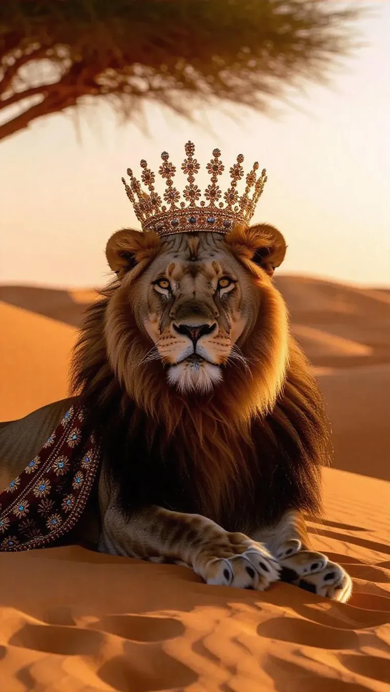 A graceful lion lounges on a sunny hill in the Sahara Desert in Niger, its luxurious mane flowing with elegance. The lion wears a glamorous feathered crown and a lavish cape intricately woven with shiny threads. Expansive dunes stretch out behind it, their rich caramel sands shimmering in the afternoon light. To the left, a collected band of nomads can be seen resting beneath a tree, their figures dark against the glowing horizon. The sky shines with vivid tones of orange and lilac, adding depth to the scenery.