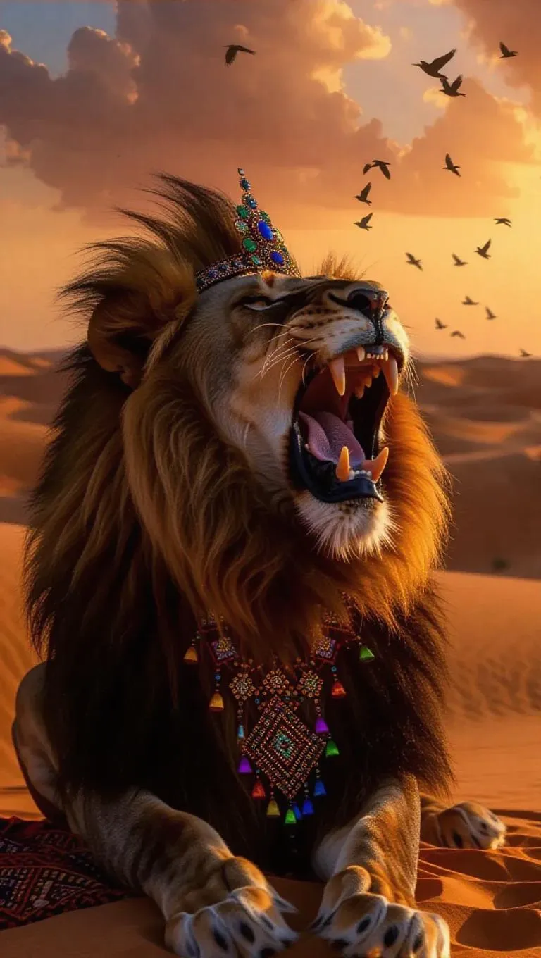 A legendary lion roars from its perch in the Sahara Desert of Mali, its mane swirling ferociously in the desert air. The lion dons an intricate bejeweled headpiece and a handcrafted wrap displaying geometric designs. In the backdrop, the golden dunes stretch endlessly, their surfaces glistening in the sunlight. A small flock of birds flies by, their silhouettes stark against the backdrop of vibrant hues. The sky blends orange and violet, crafting a breathtaking moment.