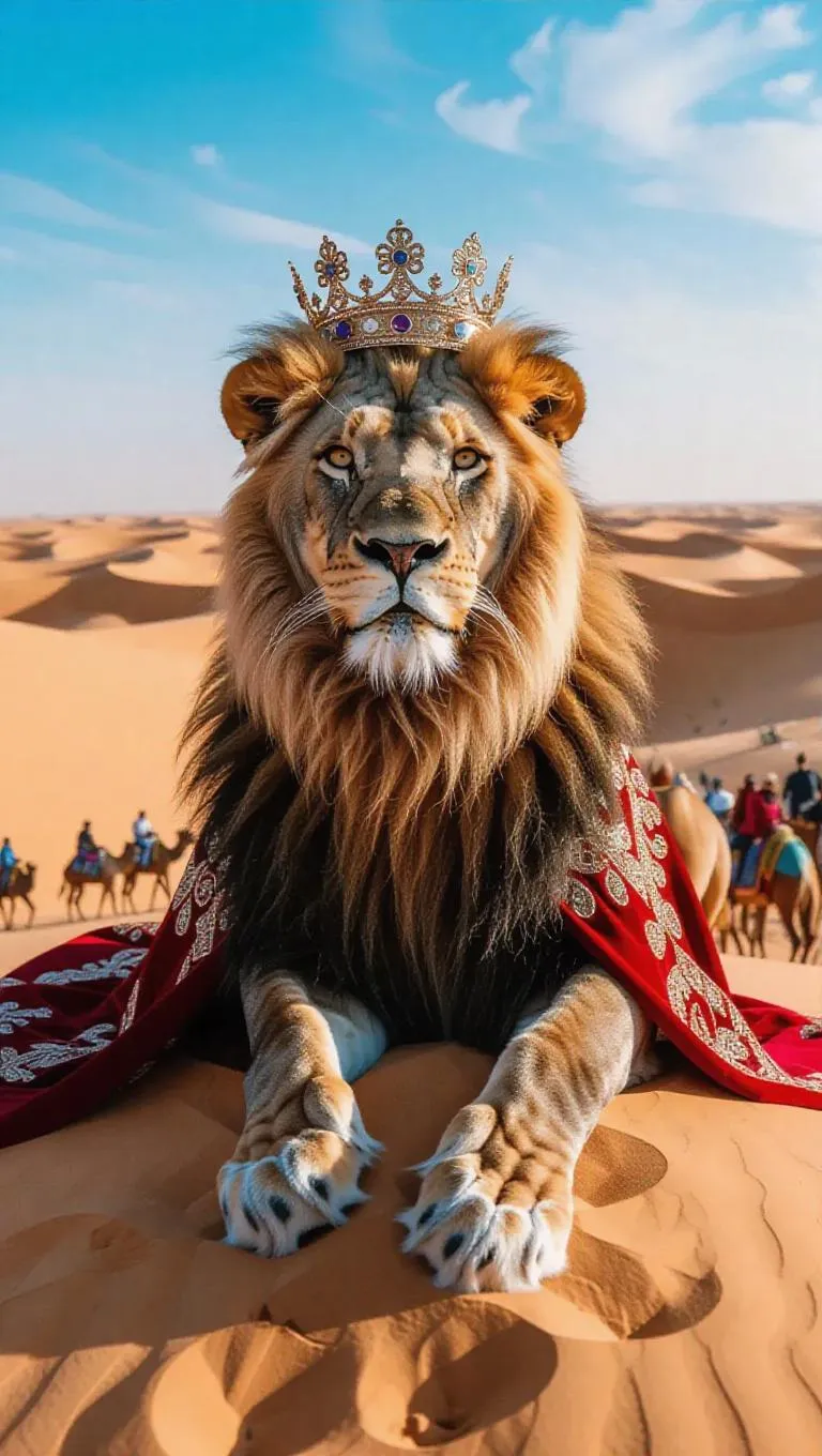 A regal lion poses majestically on a cliff overlooking the Sahara in Mauritania, its lavish mane dancing with the desert winds. The lion is clad in an elaborate crown and a richly embroidered cape. Behind it, vast dunes rise and fall, their golden sands sparkling in the early morning light. A caravan of tourists can be seen in the distance, their figures small amidst the expansive landscape. The sky is alive with colors of peach and cobalt, framing the breathtaking view.
