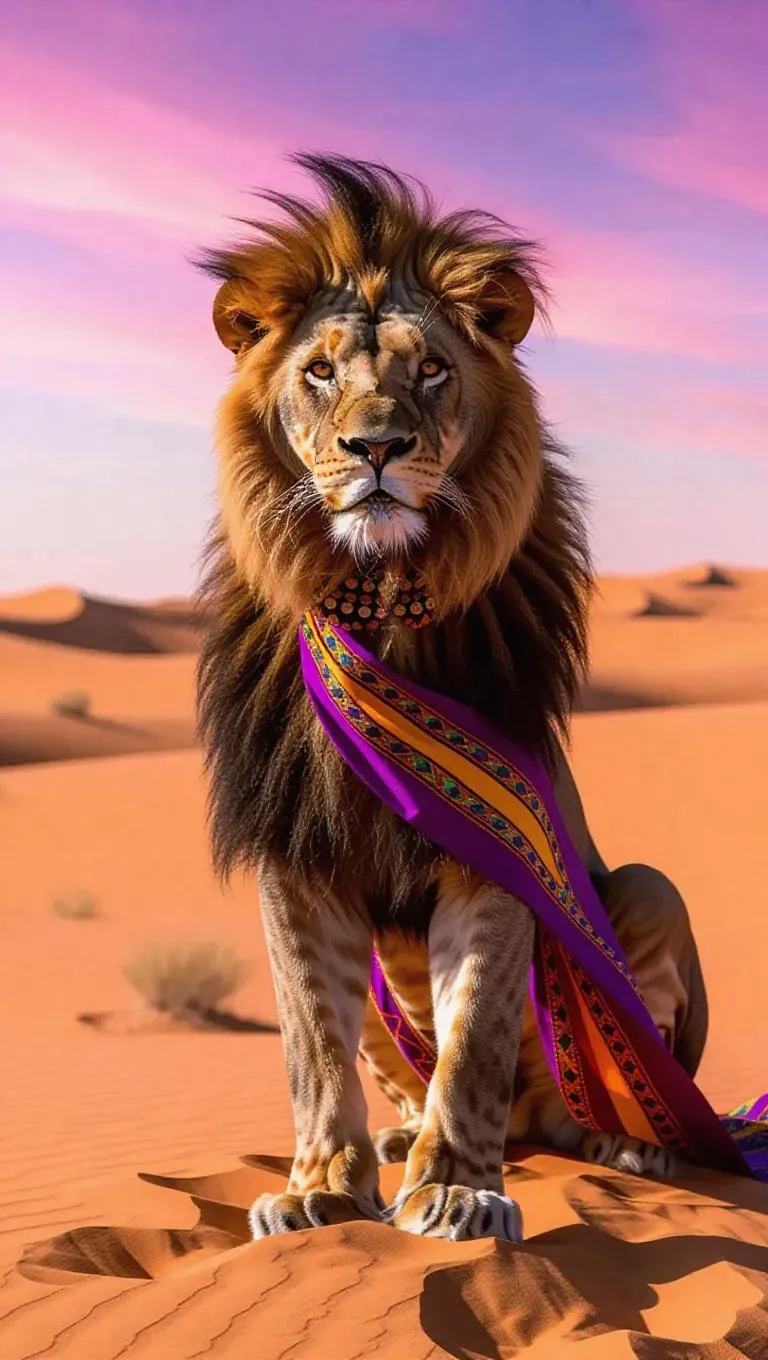 An elegant lion stands proud at the edge of the Sahara Desert in Western Sahara, its mane flowing dynamically in the light breeze. The lion is accessorized with a tribal mask and a flowing robe featuring striking colors. Endless dunes ripple behind it, their light brown sands glimmering in the sun. In the far-off distance, a small encampment can be glimpsed, their shadowy outlines silhouetted against the bright horizon. The sky is painted in colors of violet and gold, creating a magical backdrop.