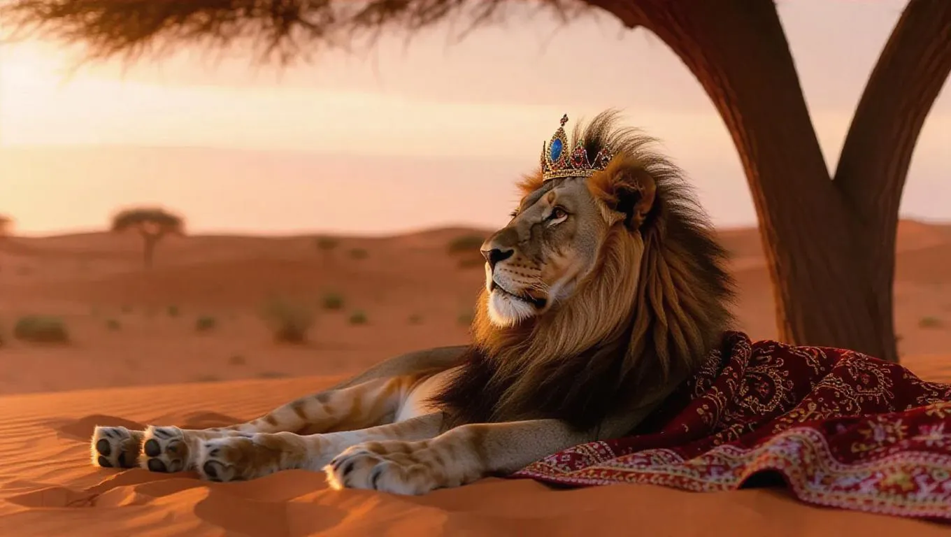 A stunning lion lounges under a tree on the outskirts of the Sahara Desert in Eritrea, its mane curling gently in the soft breeze. The lion is dressed in a royal diadem and a rich cape embroidered with historical patterns. Stretching back, the dunes of bright sherbet sand sway gently in the whispers of the land. In the distance, a vibrant oasis sparkles, creating a lovely contrast against the desert. The sky reflects the colors of sunset with hues of coral and cream, enchanting the moment.