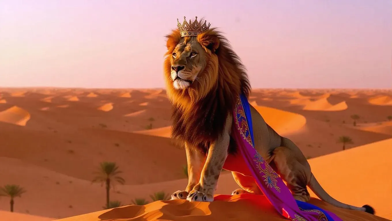 A vigilant lion stands atop a dune in the Sahara Desert in Senegal, its majestic mane swirling with the winds of change. The lion wears an ornate crown and a colorful cape draped elegantly over its shoulders. Sweeping behind, endless waves of golden dunes shine brilliantly under the broad daylight. In the distance, the shadows of a small village rest against the horizon, their shapes softened by the dying light. The sky vibrates with the colors of sunset, merging pinks and oranges into a warm embrace.