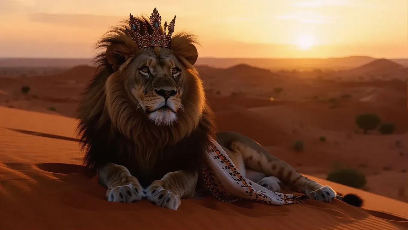 A charming lion reclines at the precipice of the Sahara in Uganda, its luxurious mane flowing like waves in the gentle breeze. The lion is adorned with a feathered crown and a light cloak featuring beautiful markings. The expansive dunes behind it ripple softly, their golden grains glistening as the sun sets. In the distance, silhouettes of islands can be perceived, creating a scenic contrast. The sky glows warmly in shades of coral and cerulean, forming a soft yet impactful scene.