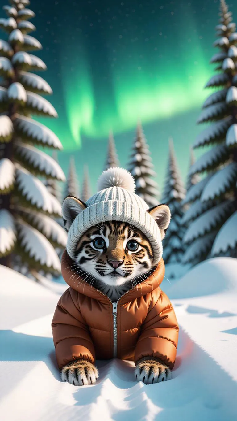 A playful cub explores the snowy terrains of Canada, its paws making light indents in the snow. The cub is clad in a warm puffer jacket and a cute cap. Behind it, pine trees heavy with snow create a festive backdrop. In the distance, the Northern Lights begin to shimmer, casting colorful reflections on the ice. The sky is a bright green, with stars just starting to appear.