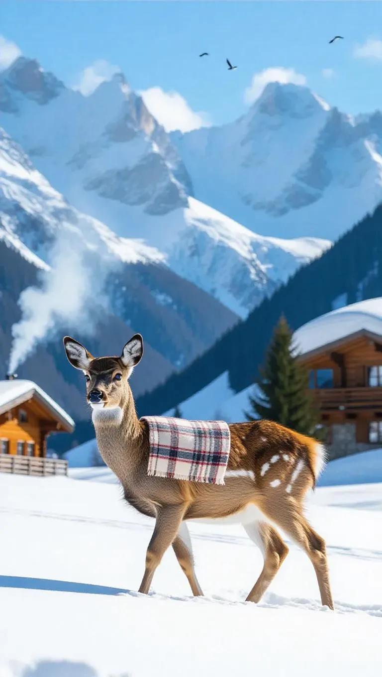 A nimble deer trots through the pristine landscapes of Switzerland, its hooves softly touching the fresh snow. The deer wears a sleek fur blanket draped elegantly over its back. Behind it, snow-capped peaks rise against a clear blue background. In the distance, a charming log cabin emits smoke from its chimney, creating a warm, inviting atmosphere. The sky is a bright azure, with a few birds flitting about.
