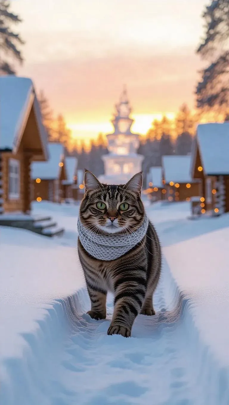An adventurous cat climbs the snowy hills of Finland, its paws lightly leaving tracks in the powdery snow. The cat is dressed in a fluffy coat and a knitted scarf. Behind it, cozy cabins line the landscape, their lights twinkling warmly. In the distance, an ice sculpture stands majestically, glistening in the sunlight. The sky is a vibrant orange, indicating the dawn of a new day.