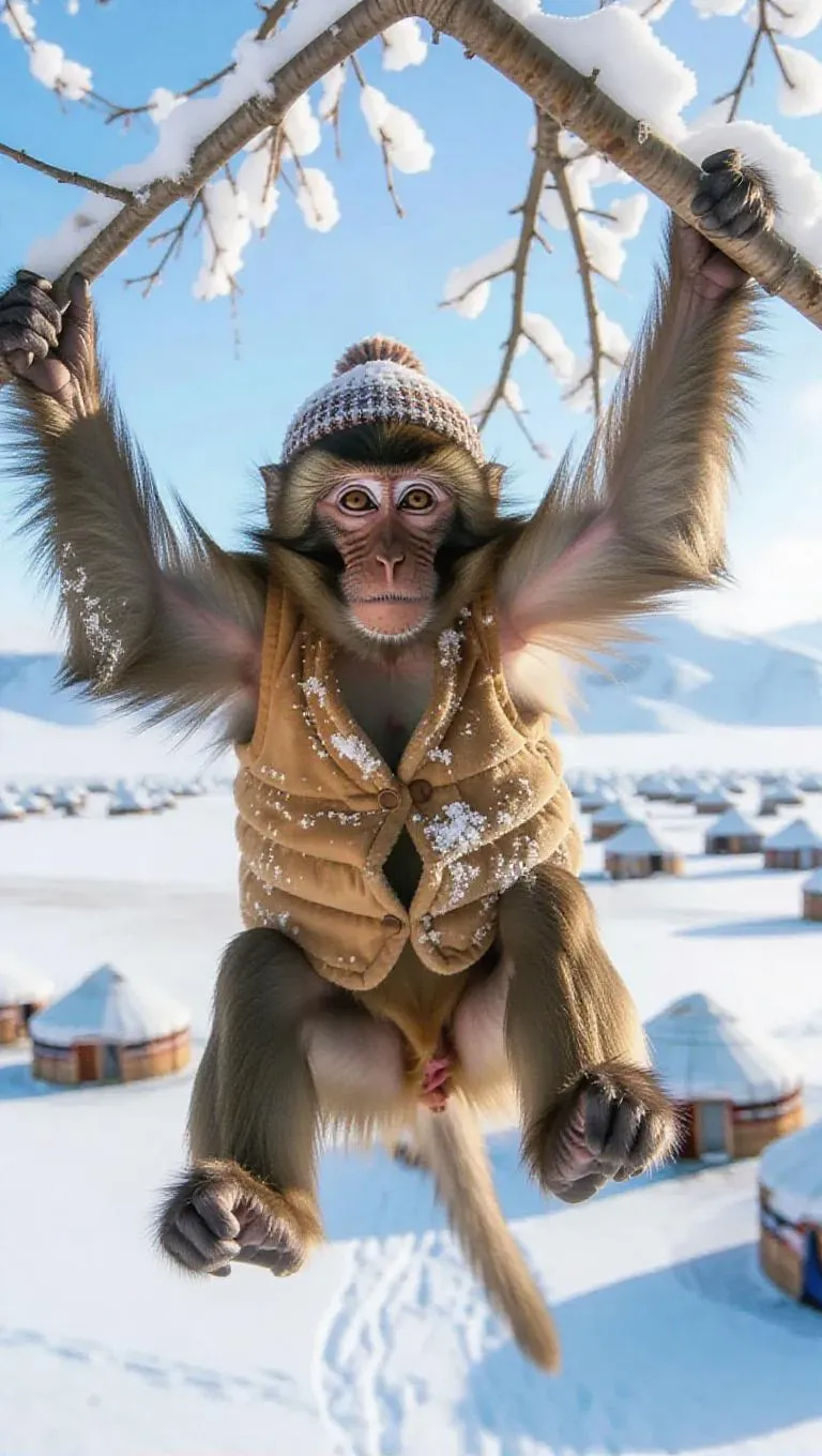 A mischievous monkey swings through the wintry realms of Mongolia, its hands gripping branches covered in snow. The monkey has on a warm fur vest and a winter hat. Behind it, vast plains stretch endlessly, with snowdrifts painting the landscape white. In the distance, a caravan of yurt dwellers sets up camp against the backdrop of snowy hills. The sky is a crisp blue, with a hint of sunrise.