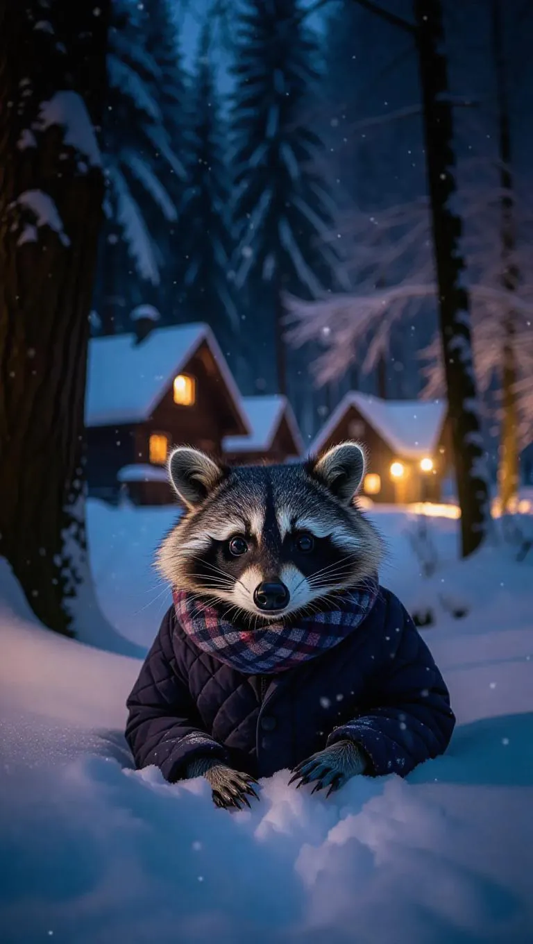 A clever raccoon scours the snowy forests of Germany, its paws digging through the blanket of snow. The raccoon sports a quilted jacket and a cozy scarf. Behind it, ancient oaks tower high, their limbs heavy with snow. In the distance, a quaint village twinkles with lights as night falls. The sky is a deep navy, sprinkled with stars.
