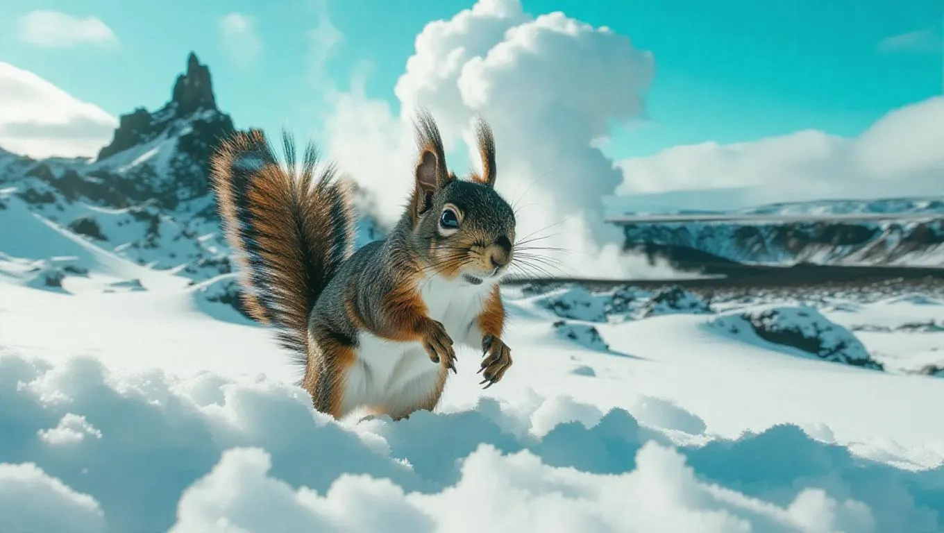 A spirited squirrel bounds through the frosty landscapes of Iceland, its tiny feet bouncing in the snow. The squirrel is dressed in a small winter vest. Behind it, volcanic rock formations rise dramatically, contrasting with the white cover. In the distance, a plume of steam escapes from a geothermal vent, creating an otherworldly scene. The sky is a bright teal, filled with billowing clouds.