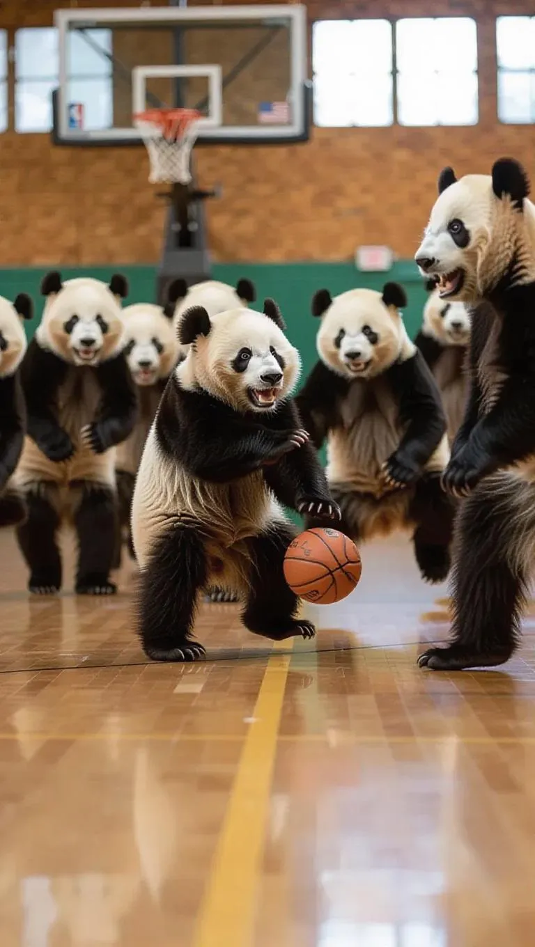 A high-energy basketball game in an indoor gym, where a team of pandas faces off against a team of monkeys. The pandas use their size and power to dominate the game, while the monkeys rely on their agility and strategic moves. The sound of squeaking shoes and the players' cheerful chatter fills the air.