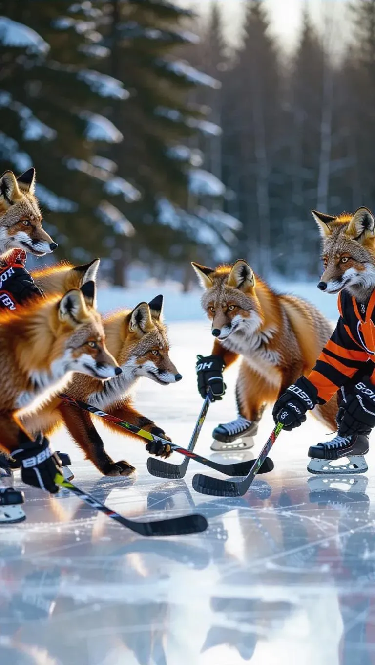 A lively ice hockey game on a frozen lake, where a team of foxes faces off against a team of beavers. The foxes use their agility and speed to dominate the game, while the beavers rely on their teamwork and strategic plays. The sound of skates gliding and the players' yips fills the air.