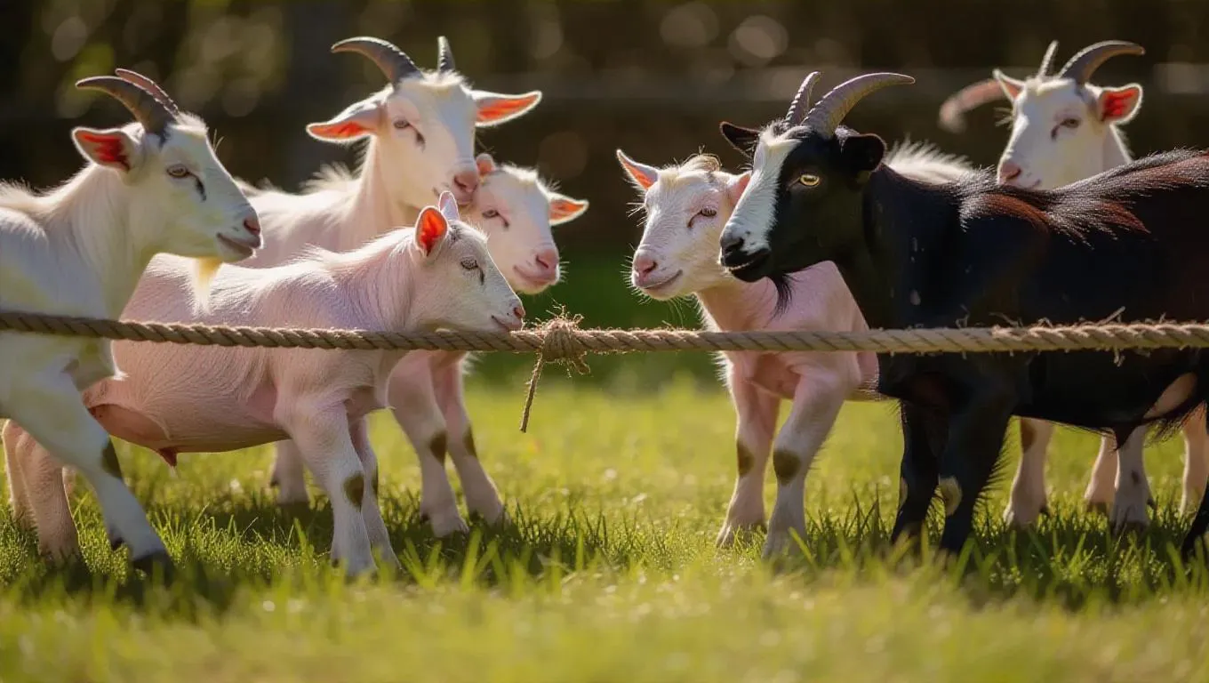 Witness a whimsical AI-generated tug-of-war between tenacious goats and determined piglets in a vibrant meadow. Create lively scenes of animal rivalry and teamwork with vivago.ai's AI tools. Perfect for dynamic, humorous visuals using cutting-edge image/video generation and effects.
