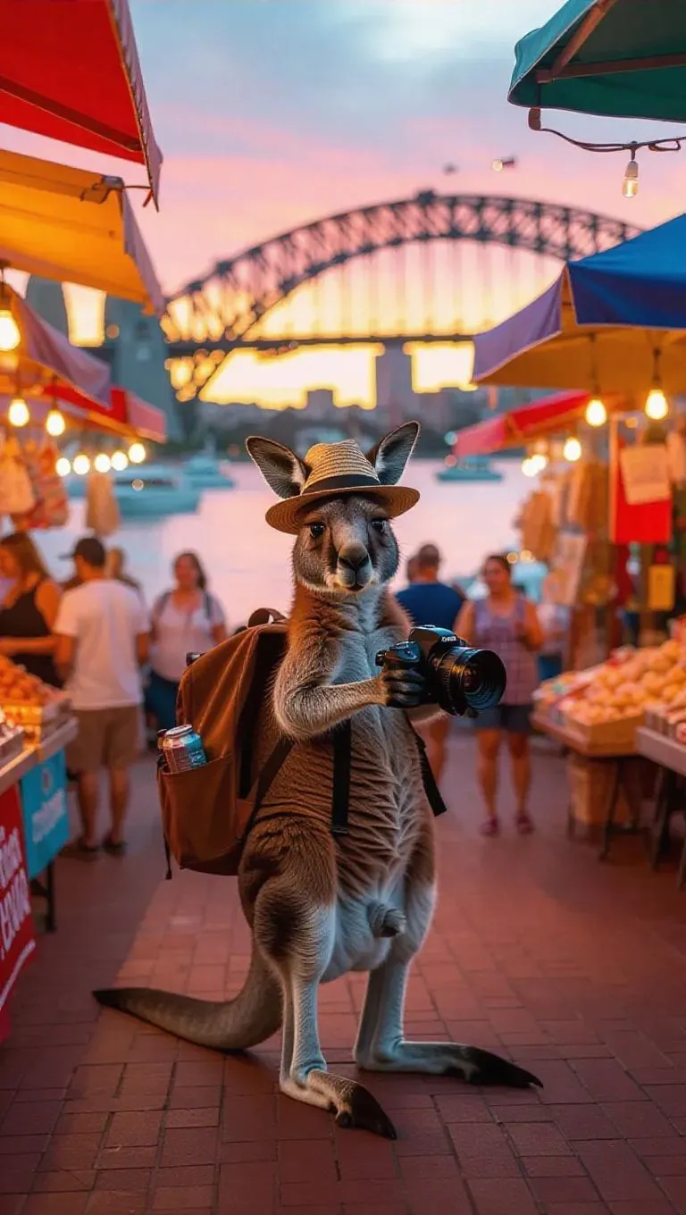 A playful kangaroo skims the colorful markets of Sydney, Australia, clutching a camera in one paw. The kangaroo sports a straw hat and a backpack, its pouch filled with souvenirs. Surrounding it, the vibrant stalls of local artisans create a lively atmosphere, and the harbor is dotted with yachts and water taxis. Beyond, the Harbour Bridge curves gracefully against the sunset, its structure glowing in soft hues. The air is rich with the aroma of street food and the chatter of visitors.