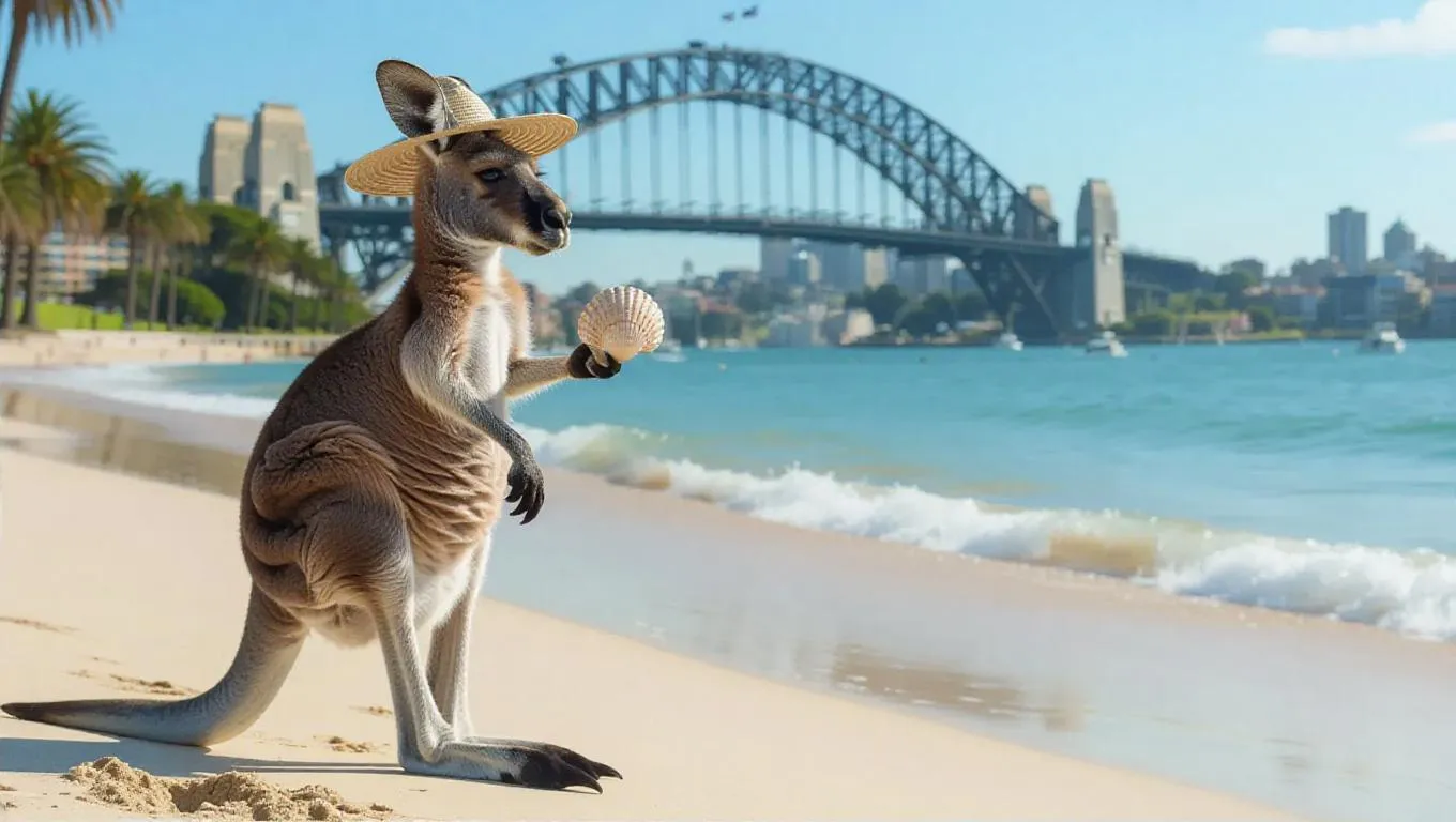 A thoughtful kangaroo strolls along the tranquil beaches of Sydney, Australia, holding a shell in one paw. The kangaroo wears a sun hat and a sarong, its pouch filled with beach towels. Nearby, gentle waves lap the shore, while the harbor can be seen glistening under the midday sun. In the background, the Harbour Bridge stands tall against a serene backdrop. The air is calming, filled with the sounds of nature and the gentle breeze.