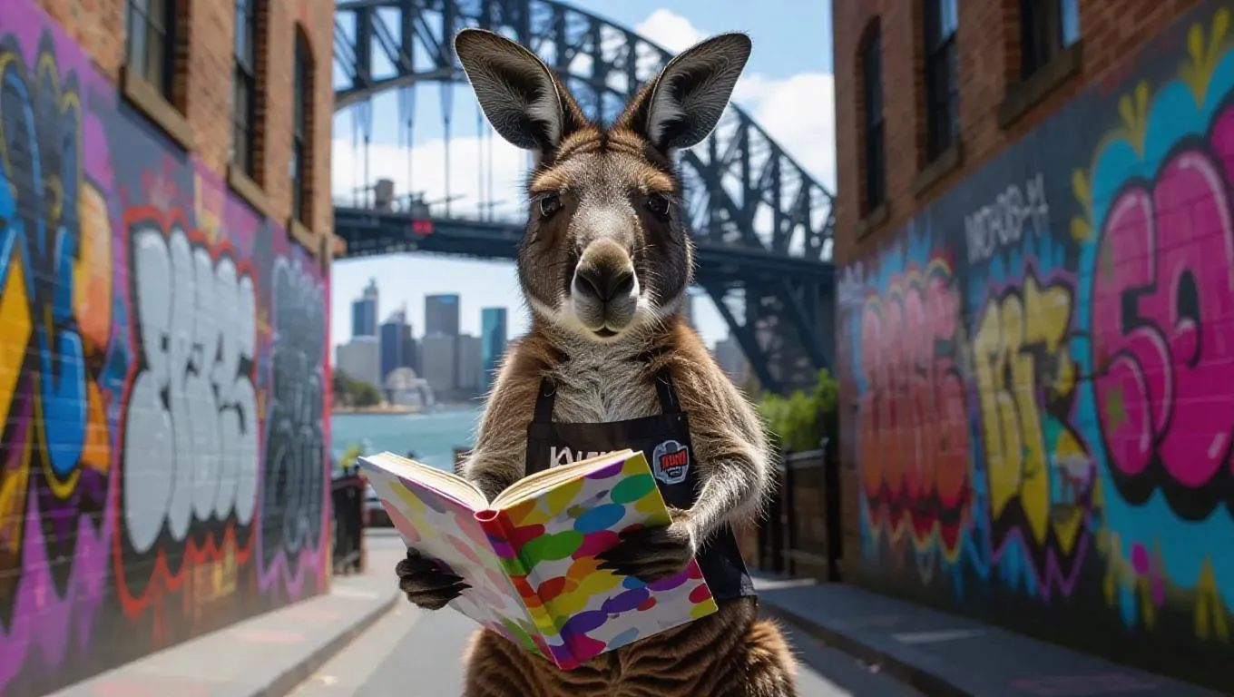 A crafty kangaroo hops through the vibrant artsy alleys of Sydney, Australia, clutching a sketchbook in one paw. The kangaroo wears an artist's apron and a headband, its pouch filled with charcoal and paper. Surrounded by art installations and graffiti walls, the harbor is a bustling hub for creative minds. In the distance, the Harbour Bridge impressively frames the artistic landscape. The air buzzes with creativity and youthful energy.