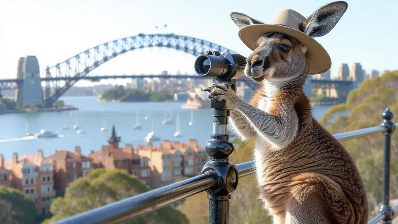 An inquisitive kangaroo climbs the lookout points in Sydney, Australia, peering through binoculars with one paw. The kangaroo wears a safari hat and cargo shorts, its pouch filled with wildlife guides. Nearby, scenic views of the city unfold, while the harbor glimmers invitingly. In the distance, the Harbour Bridge stretches proudly against a clear sky, its arches commanding attention. The air is filled with the sounds of observation and the calls of distant birds.