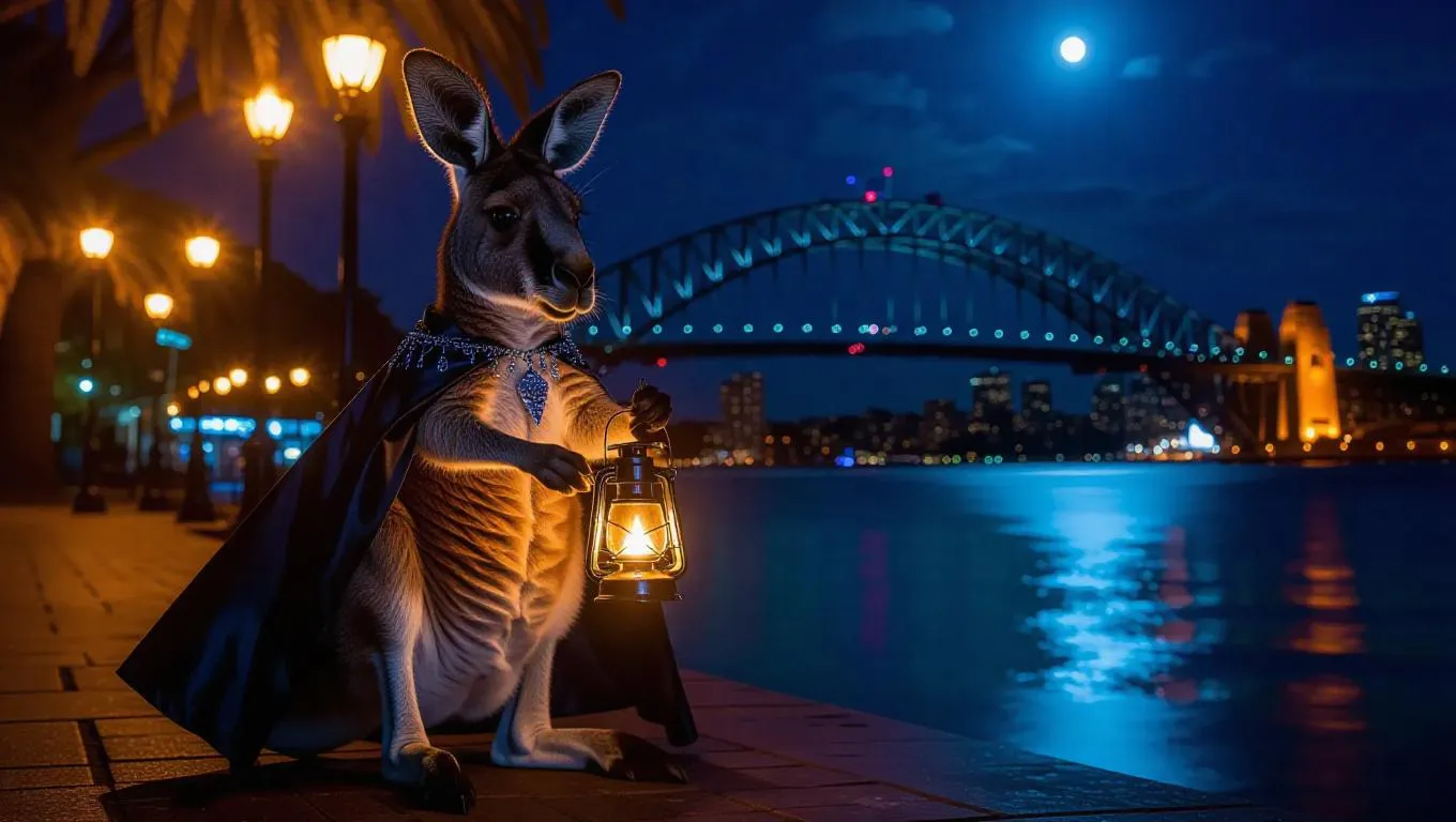 A dreamy kangaroo wanders through the nighttime streets of Sydney, Australia, cradling a lantern in one paw. The kangaroo sports a flowing cape and twinkling jewelry, its pouch filled with glowing stars. Nearby, streetlights create a cozy ambiance, while the harbor reflects the moonlight. In the distance, the Harbour Bridge is beautifully lit, enhancing the night’s magic. The air is serene, whispering tales of wonder and mystery.