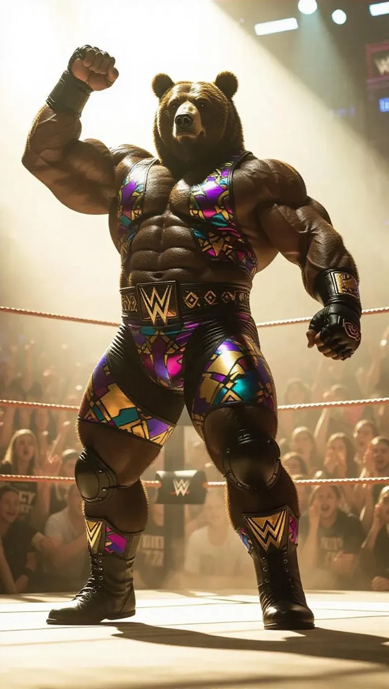 An anthropomorphic bear gladiator enters a professional wrestling arena, wearing a custom wrestling singlet adorned with vibrant colors and patterns. His overbuilt muscles ripple beneath the fabric as the camera starts at his feet, slowly panning up to his determined face. The crowd roars in excitement, dust rising with each heavy footfall. He flexes his biceps and chest, his intense gaze scanning the audience with raw power. Dramatic lighting casts deep shadows, enhancing his imposing figure. The atmosphere is electric with the energy of the cheering crowd.